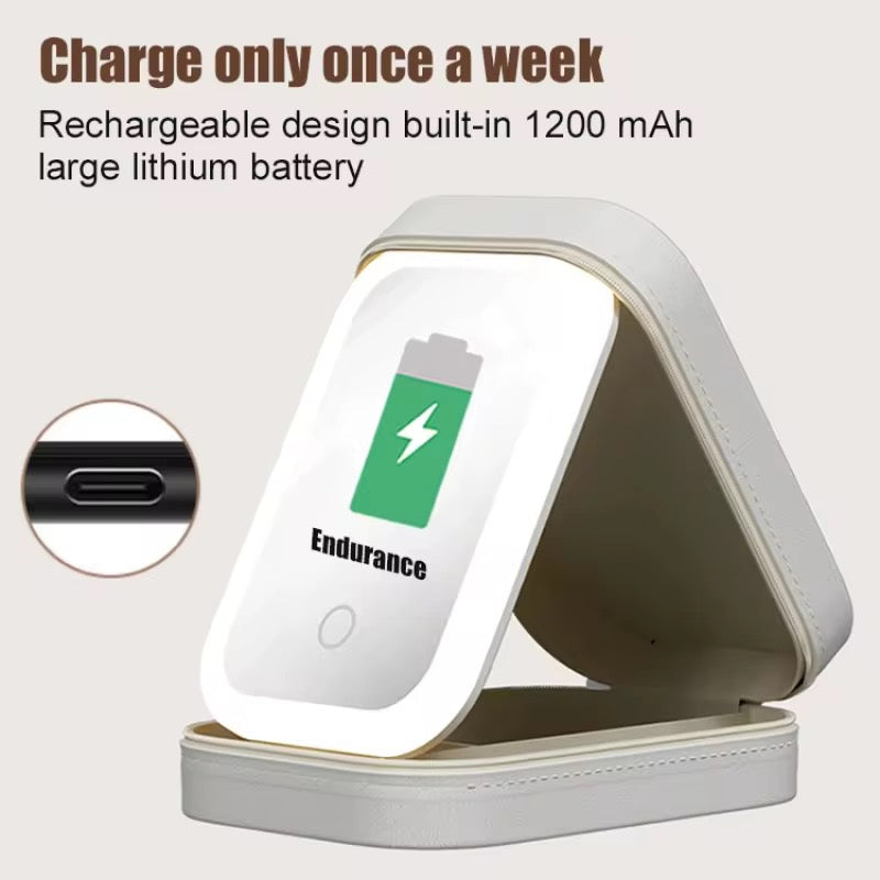 Miroir de maquillage LED rechargeable, boîte de rangement de cosmétiques de voyage portable, trousse de maquillage de voyage avec miroir lumineux réglable en 3 couleurs.